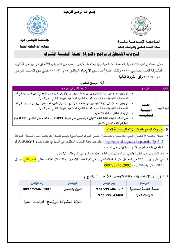 الإعلان عن فتح باب الالتحاق في برنامج الدكتوراة المشترك في الصحة النفسية