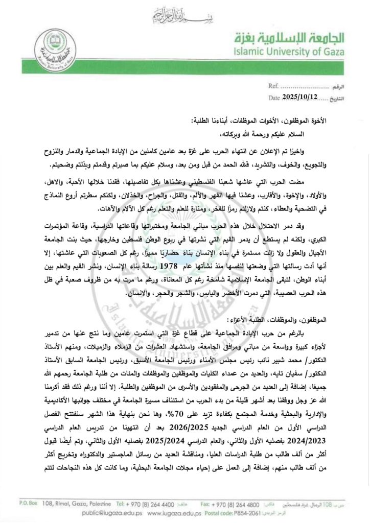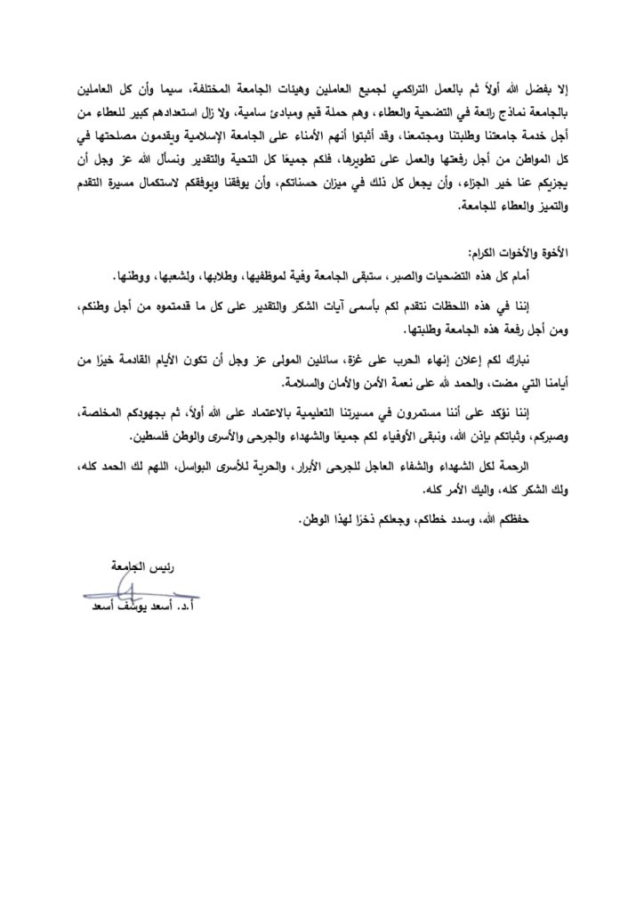 بيان صادر عن الجامعة الإسلامية بخصوص الإعلان عن انتهاء الحرب على غزة
